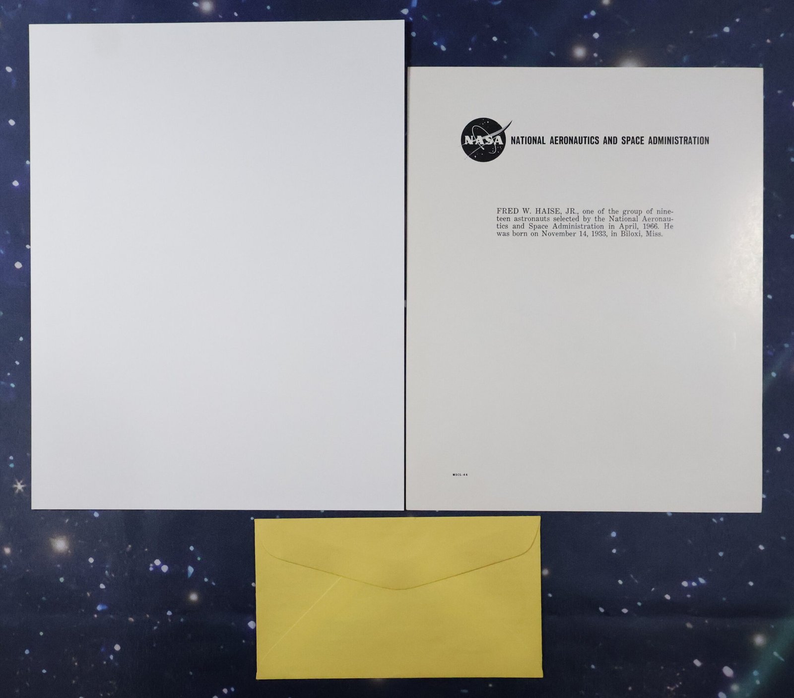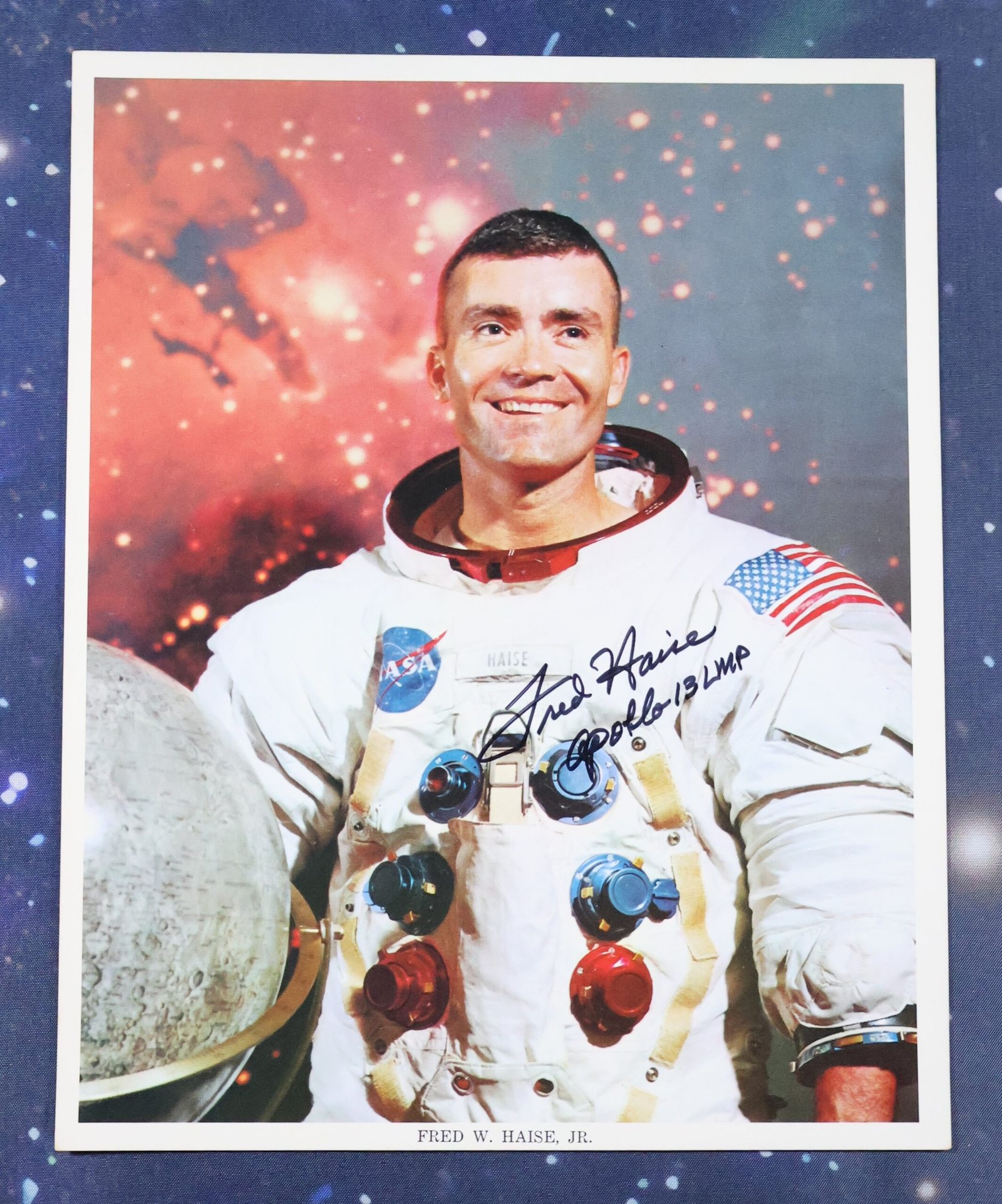 Three very nice items that have been hand signed  by Apollo 13 Astronauts James Lovell and Fred Haise. The first is a hand signed 11" x 8 1/2" photograph of James Lovell capturing him posing in his white space suit. Secondly, a hand signed 8" x 10" official NASA issued lithograph of Fred Haise in his white space suit. The collection is completed with an Apollo 13 mission emblem cover that has been hand signed by both James Lovell and Fred Haise.  Each item is in very good to excellent condition with minor signs of edge and handling wear.
