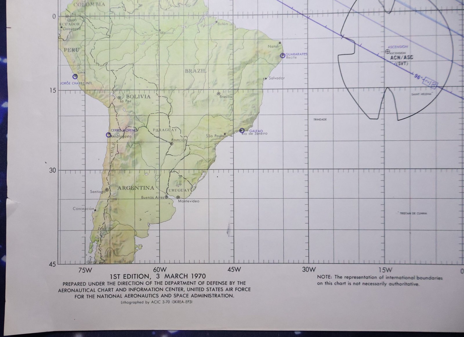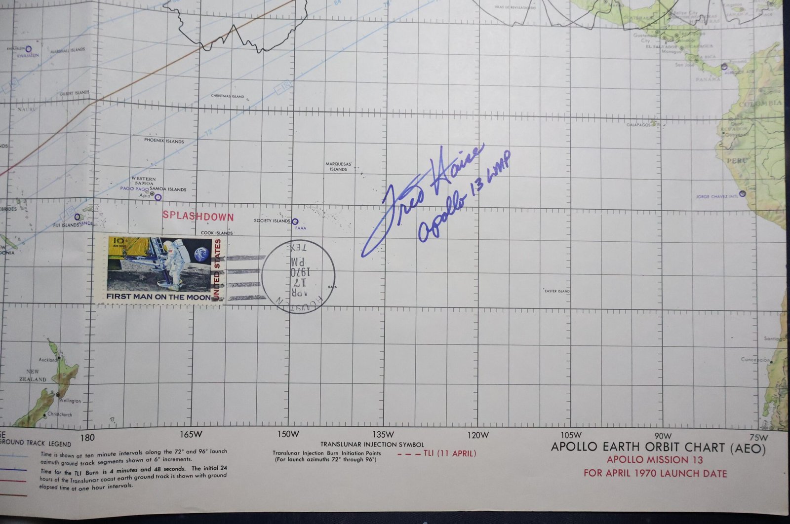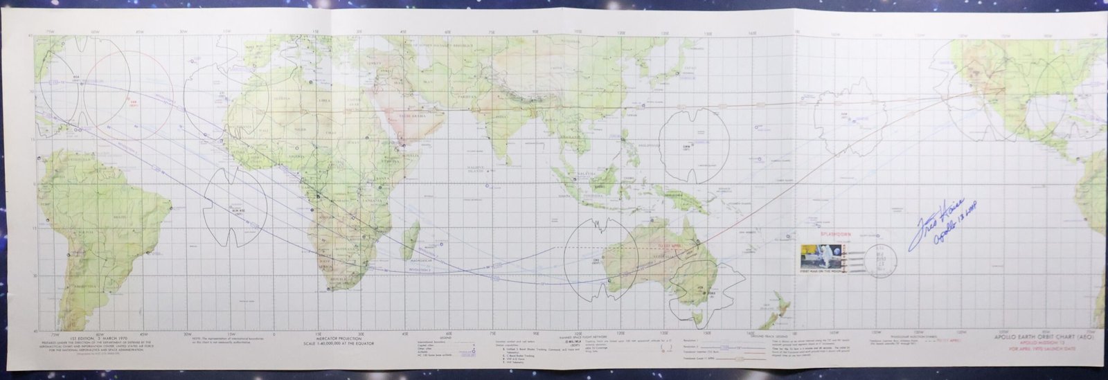 An official 1970 NASA Apollo Earth Orbit Chart from the Apollo 13 mission. This chart has been hand signed by Astronaut Fred Haise with "Apollo 13 LMP" added and displays a Splashdown cancellation stamp dated March 17, 1970. The chart measures approximately 13 1/2" x 41" and is in very good condition with some light handling wear and a small edge tear. This chart has been stored folded. This chart offers a glimpse into the trajectory and path of the Apollo 13 mission.