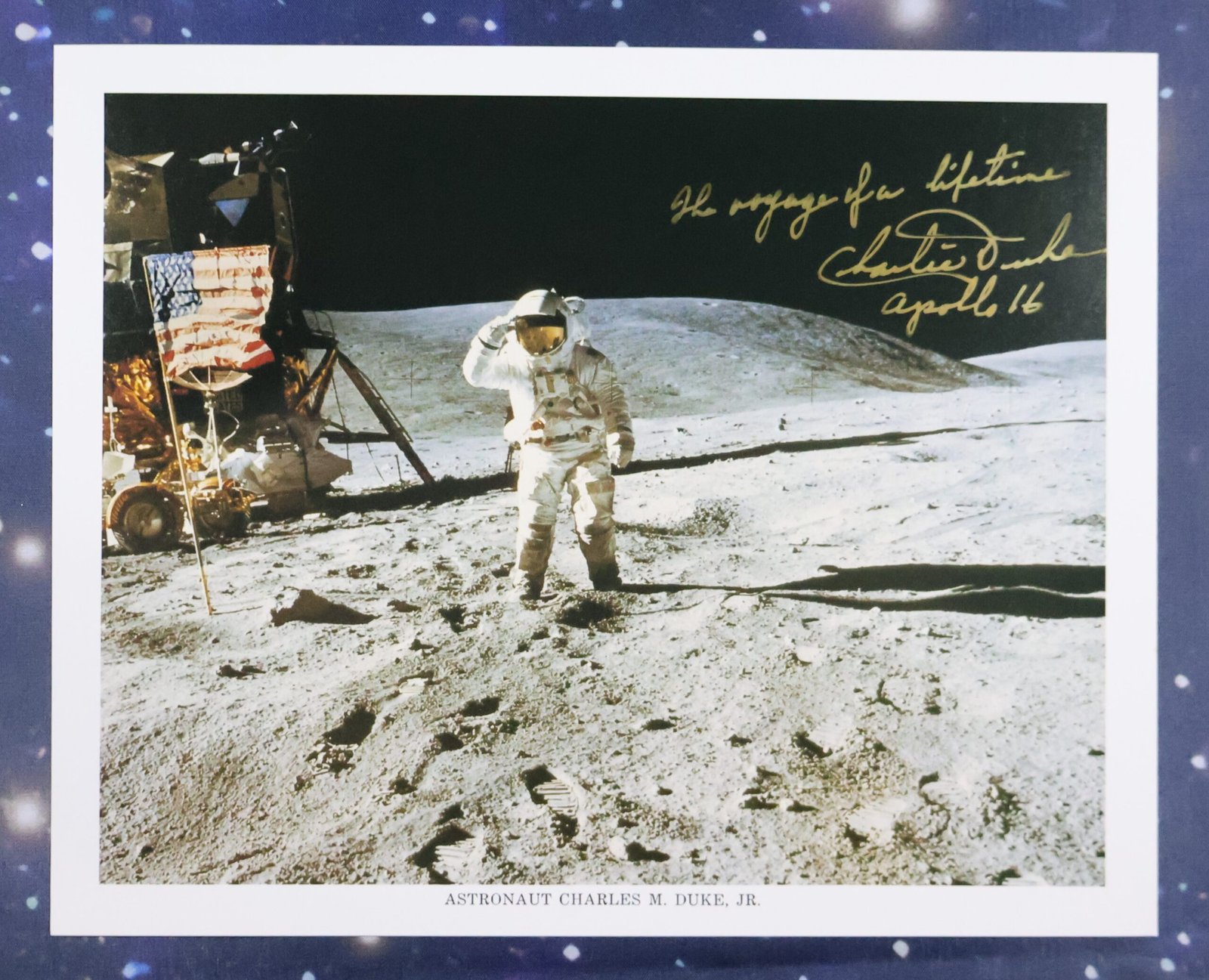 A beautiful lithograph showing Astronaut Charlie Duke saluting the American flag on the Lunar Surface during the Apollo 16 mission.  The lithograph has been hand signed in gold ink pen with "The voyage of a lifetime - Apollo 16" added.  This lithograph measures 8" x 10" and is in excellent condition with minimal edge and handling wear.