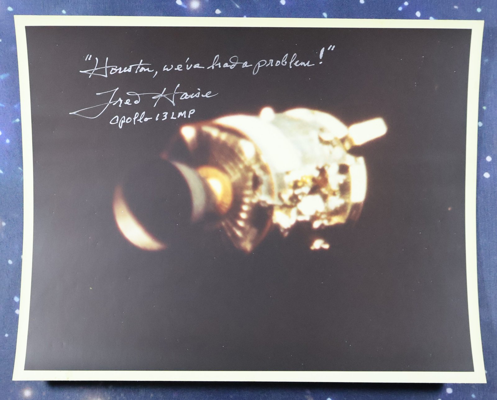 This is a great image of the Damaged Service Module captured during the Apollo 13 mission. This vintage photograph has been hand signed in silver pen by Astronaut Fred Haise with the iconic quote "Houston, we've had a problem!" added. Fred Haise was the Lunar Module Pilot for the Apollo 13 mission. This 8" x 10" photograph is printed on "A Kodak Paper" and is in very good condition with light surface wear and staining on the reverse side that does not affect with the front image of the photograph.