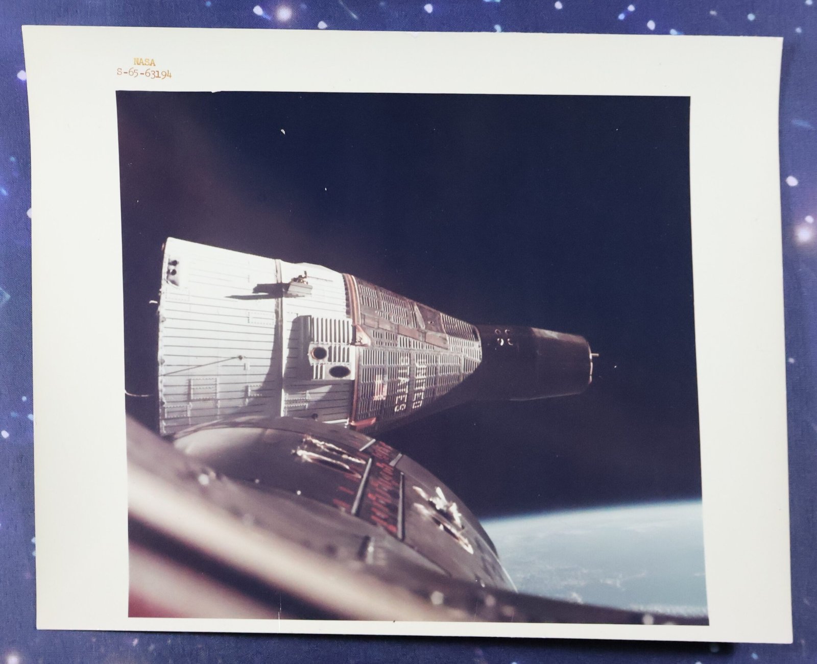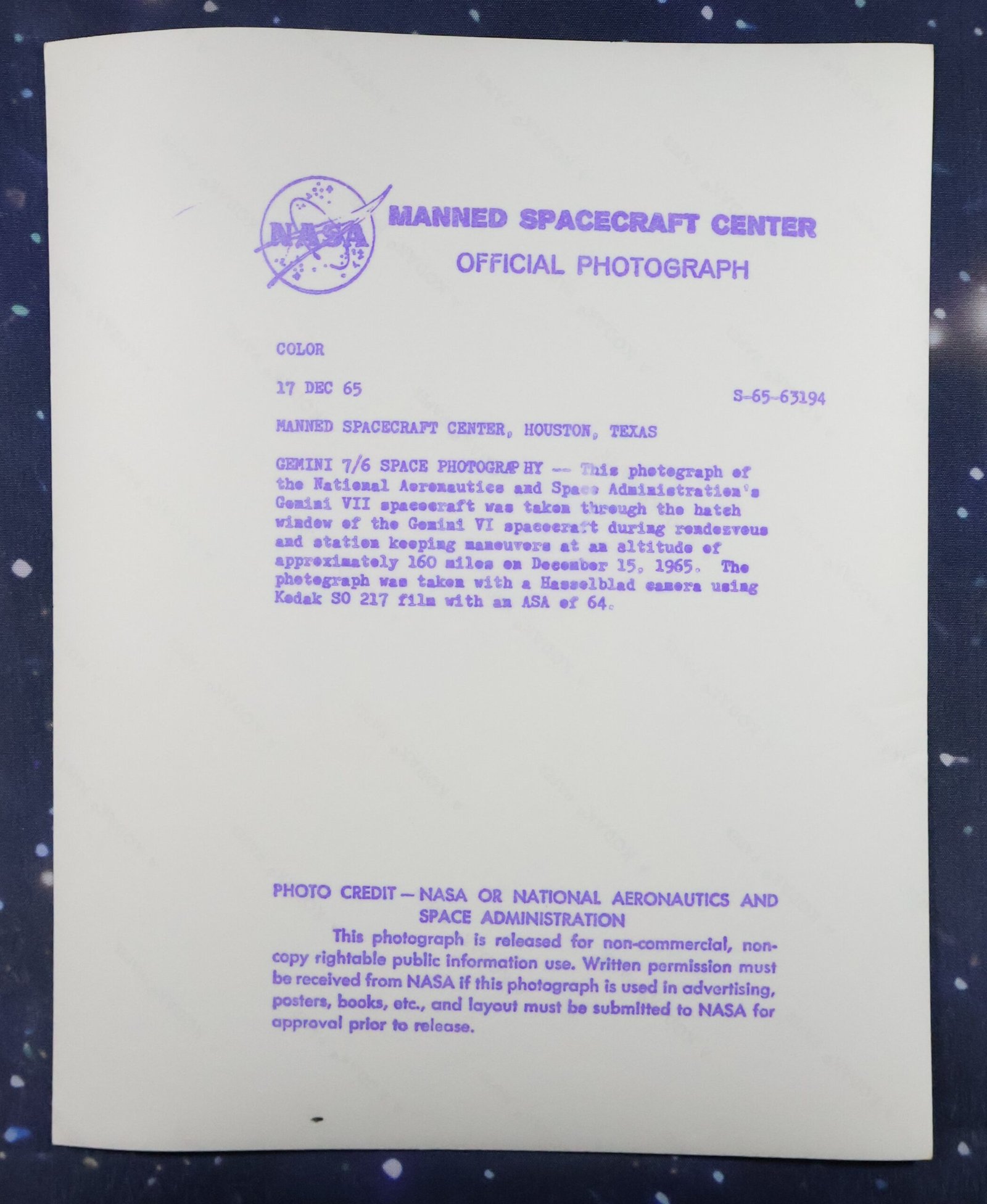 An official and vintage NASA red numbered (S-65-63194) photograph showing an image of the Gemini VI spacecraft captured from the Gemini VII spacecraft during the rendezvous of the two spacecrafts. This 8" x 10" photograph is printed on "A Kodak Paper" and is in very good condition with some edge dings and light edge creases. The photograph displays the blue NASA descriptive text on the reverse side.
