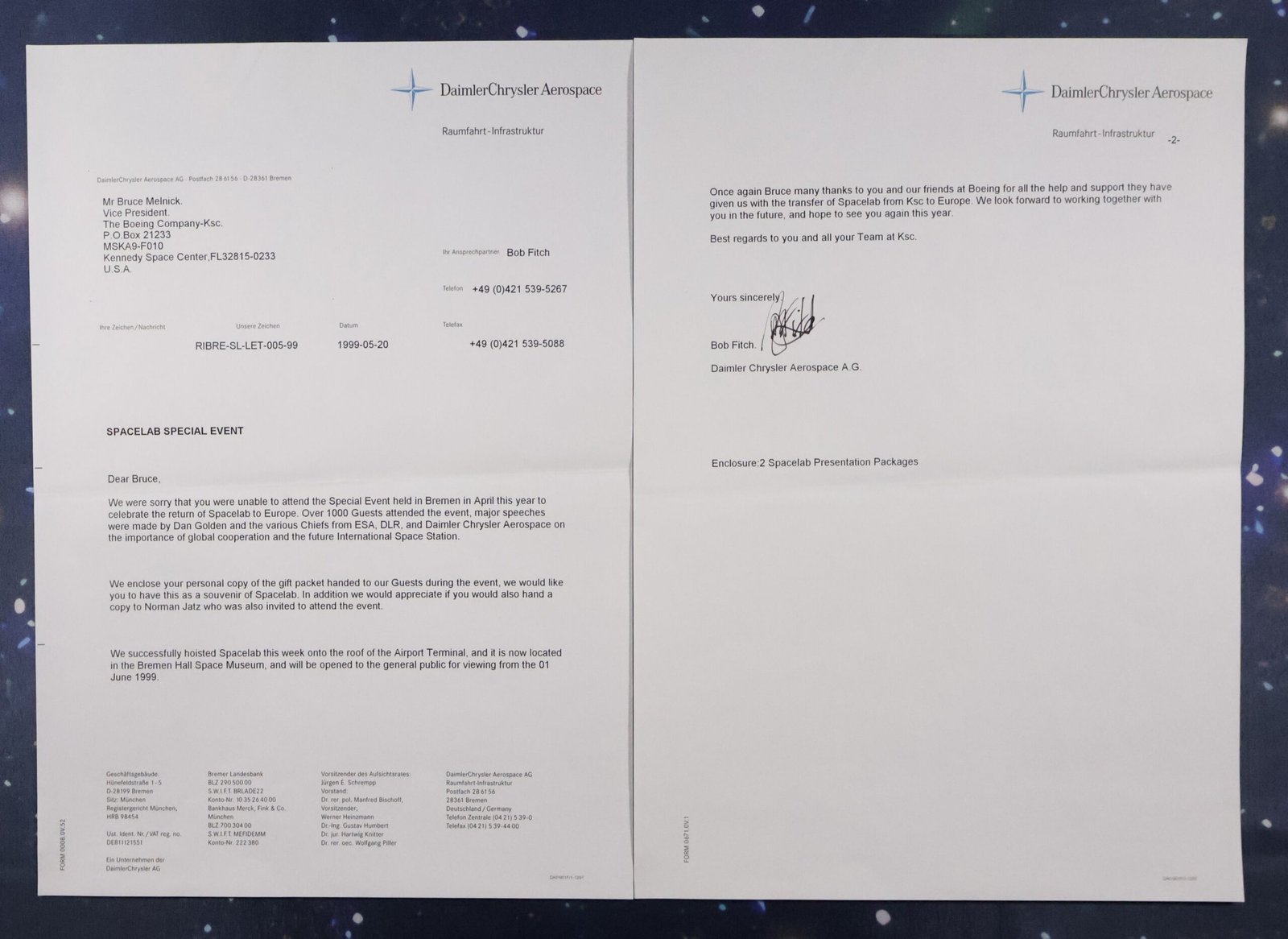 A hard to find and seldom seen STS-55 Mission Spacelab D-2 flown materials souvenir book from the German Daimler Chrysler Aerospace Corporation that was given to Astronaut Bruce Melnick. This book entitled “The Spirit of Spacelab” details the highlights of the mission and has a section of Mission Flown Seal along with a sample of Garden Cress Seeds from the plant experiments and Thermal Protection gold film. These mission souvenir books were produced in very small numbers and this one includes the letter to Bruce Melnick. The souvenir book is accompanied by two letters to Brue Melnick from the Daimler Chrysler Aerospace company. It is in very good condition with some storage and handling wear mostly to the protective cover. The item measures 8 ½” x 10”.